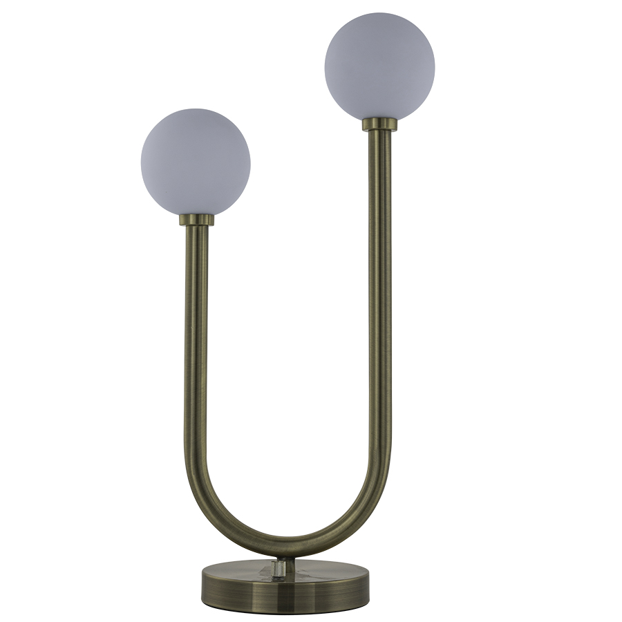 25"H Dark Brushed Brass Table Lamp, two G9 sockets, dimmer switch, 8' Silver 45° cord, two Opal Matte Glass Globes, recommend two 4 watt JCD G9 LED bulbs