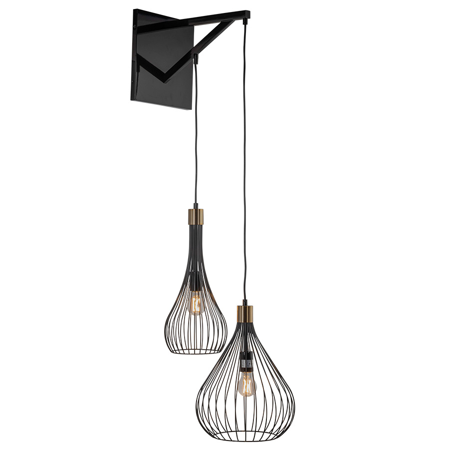 52.75"H Satin Black Aluminum #908 and Antique Brushed Brass #310 Wall Lamp, two medium base sockets, Direct Wired, two Metal Cage Shades, recommend two 8 Watt Clear A19 LED Filament bulbs
