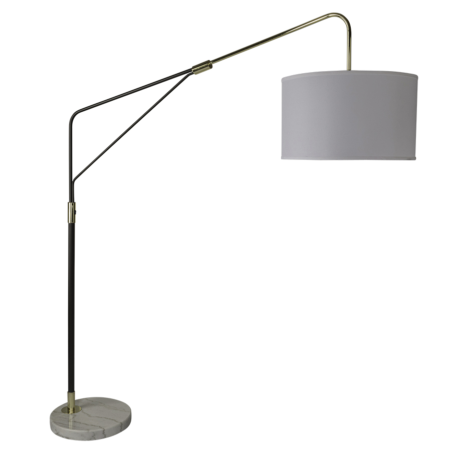 76"H Dark Bronze Powder Coat and Satin Brass Floor Lamp with White Marble Base, "S" arm medium base socket, on/off rocker switch on column @ 42"AFF, 8' Silver 45° cord, 20"x20"x12" White Linen Hardback Shade with White Frosted Acrylic Bottom Diffuser, Ships Knock Down. recommend two 1100 lumen LED bulbs