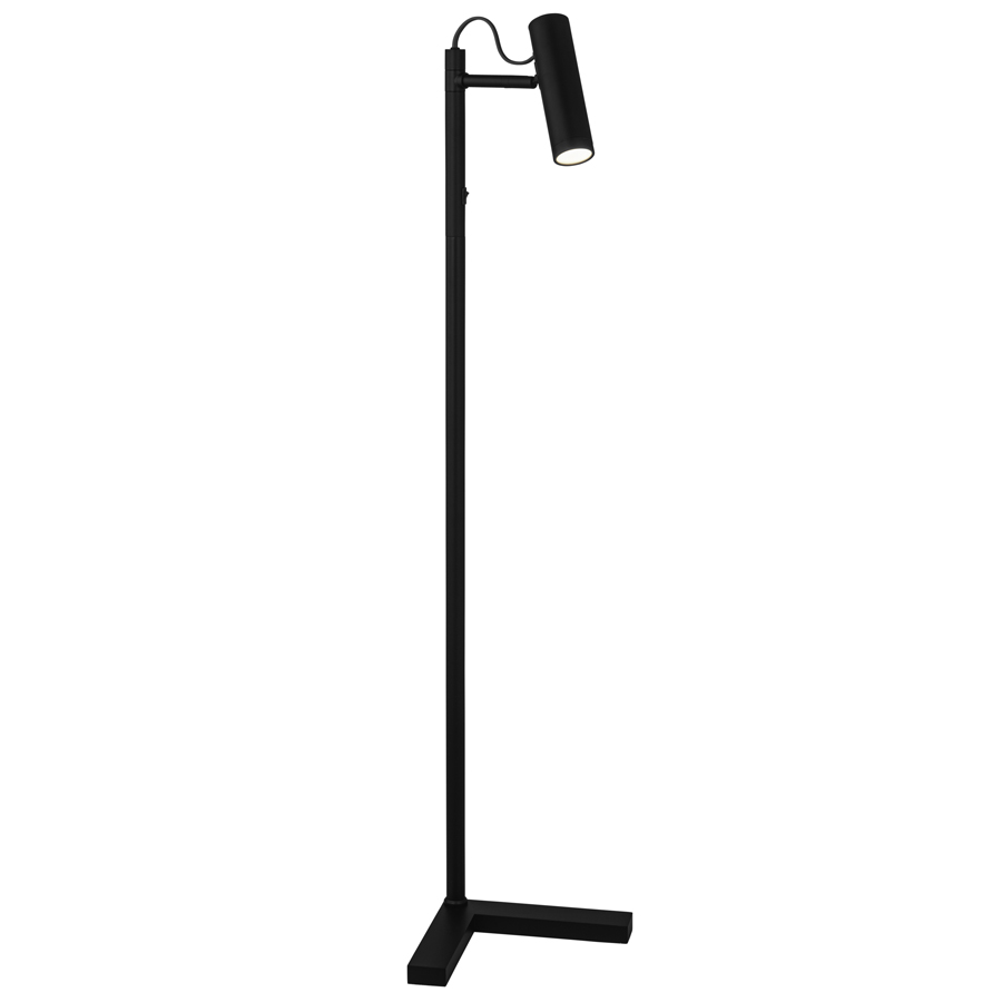 46"H Matte Black Integrated LED Floor Lamp with Solid Iron base, 6 watt LED, 600 lumen, 2700K, 90CRI, 120V AC, one on/low/high/off three stage rocker switch on column @ 38"AFF, 8' Blue Braided Fabric Wrapped cord with regular plug to match Benjamin Moore 1595 Rocky Coats, with rotatable Metal Shade