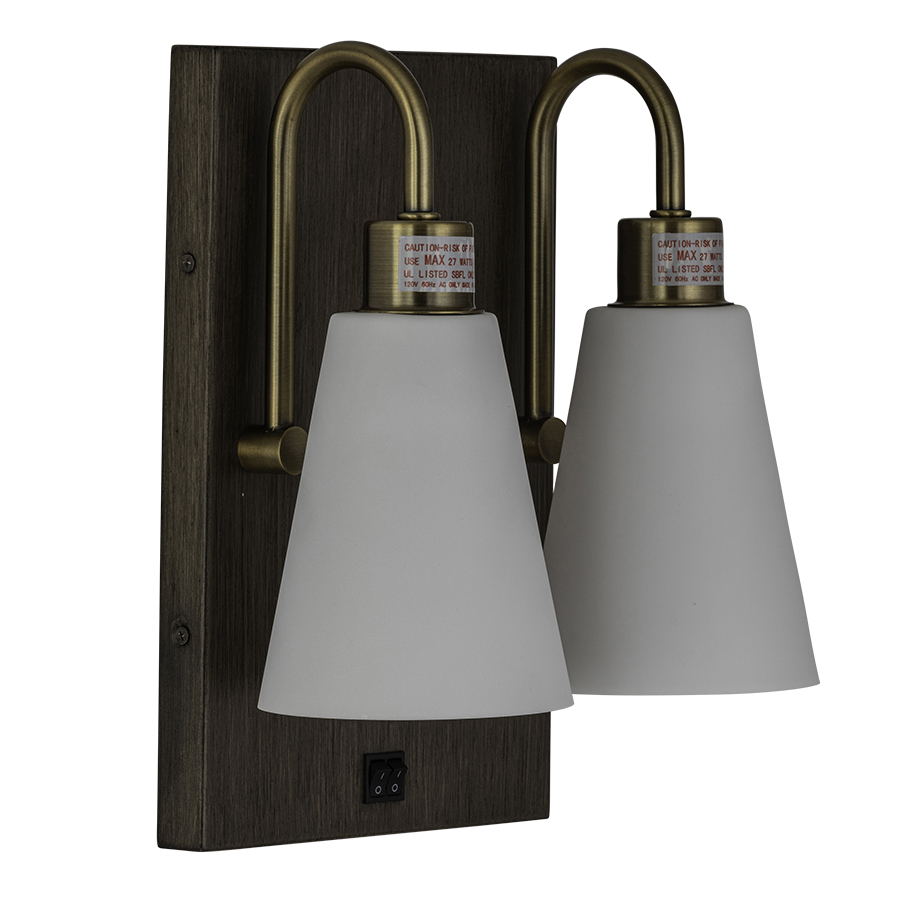 13"H Brushed Brass and Faux Wood Headboard Wall Lamp, two medium base sockets, dual on/off rocker switch at backplate, direct wired, two White Frosted Acrylic Tapered Shades with bottom acrylic diffusers, recommend two 1100 lumen LED bulbs