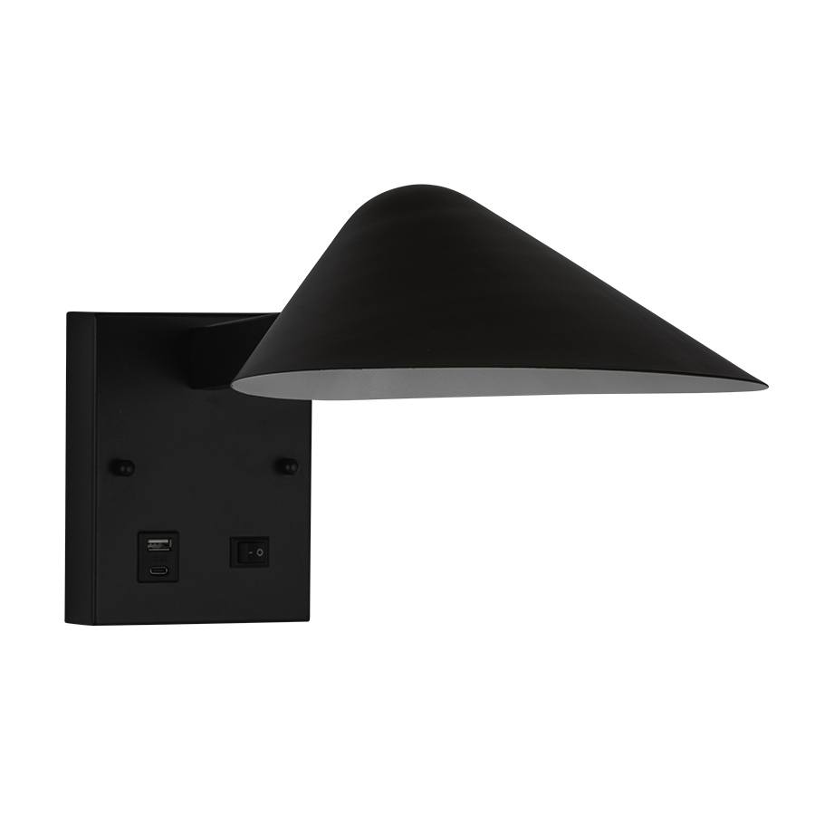 8.5"H Bronze Powder Coat Wall Lamp, medium base socket, on/off rocker switch at backplate, one USB port and one USB-C port, 8' Silver 45° cord exiting out bottom of lamp, with Metal Shade, recommend 800 lumen LED bulb