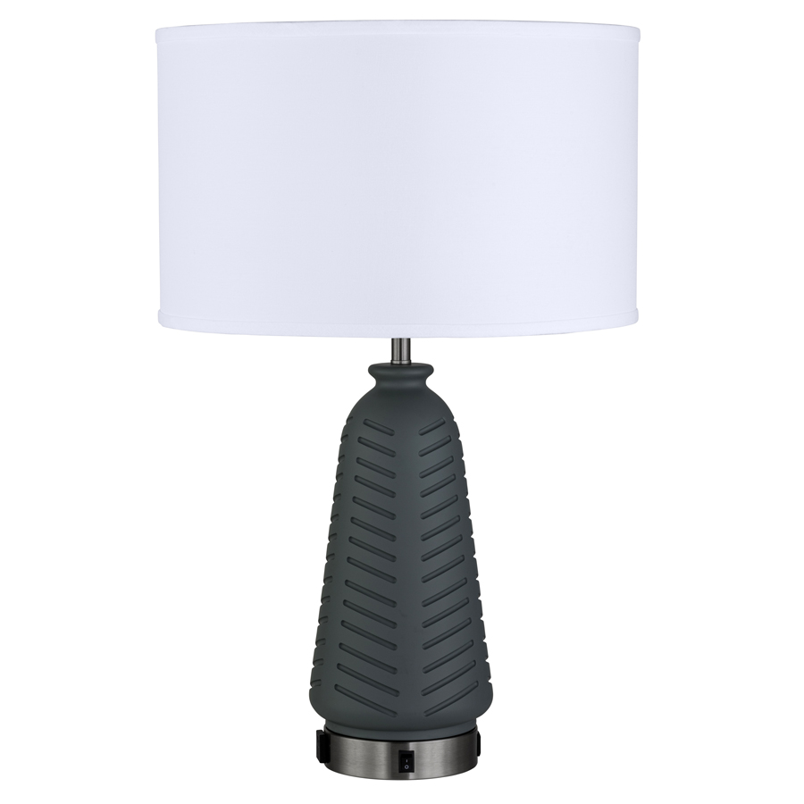28"H Matte Silver Pine Resin and Brushed Nickel Table Lamp, medium base socket, on/off rocker base switch, one outlet, dual USB port A + C, 10' Silver 45° 3-prong grounded cord, all metal parts have extra clear lacquer coating, 18"x18"x11" White Linen Hardback Shade, recommend 1100 lumen LED bulb