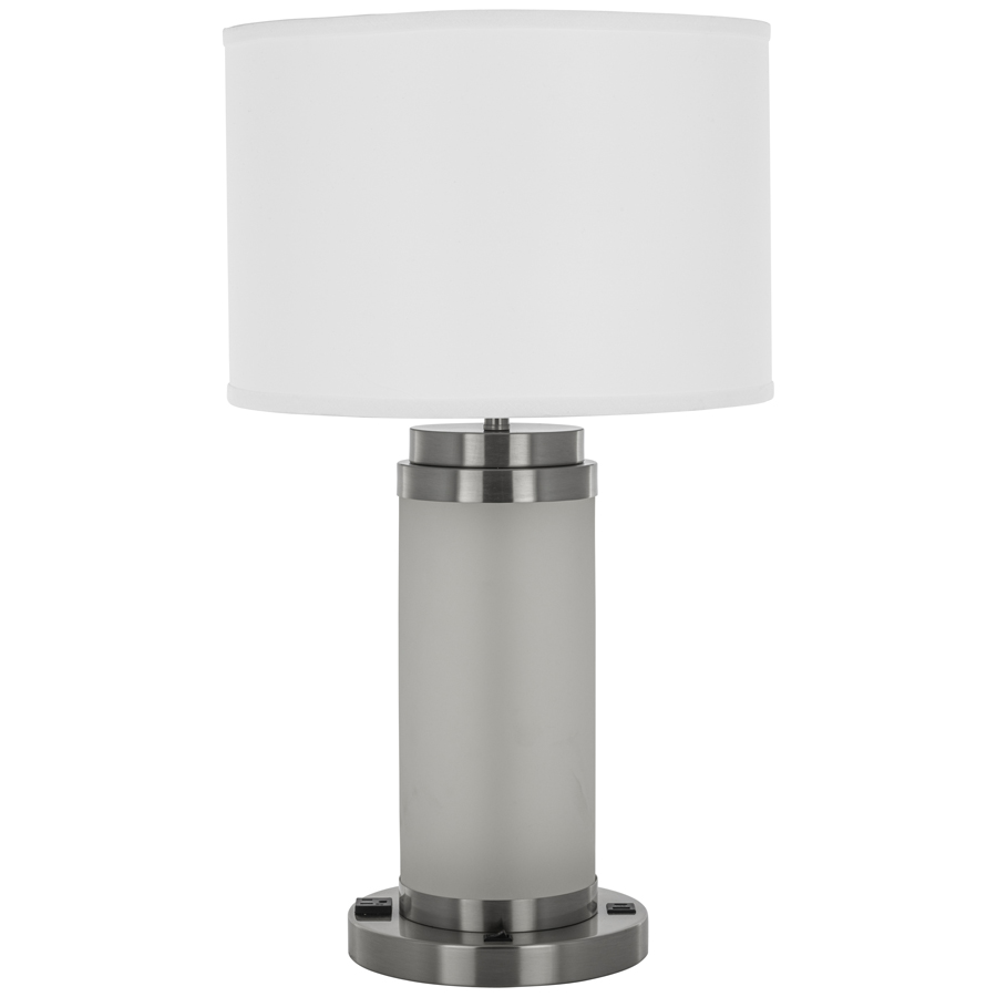 28"H Semi-Translucent Resin and Brushed Nickel Table Lamp, medium base socket, on/off rocker base switch, one outlet, dual USB port A + C, 10' Silver 45° 3-prong grounded cord, all metal parts have extra clear lacquer coating, 16"x16"x10.5" White Linen Hardback Shade, recommend 1100 lumen LED bulb