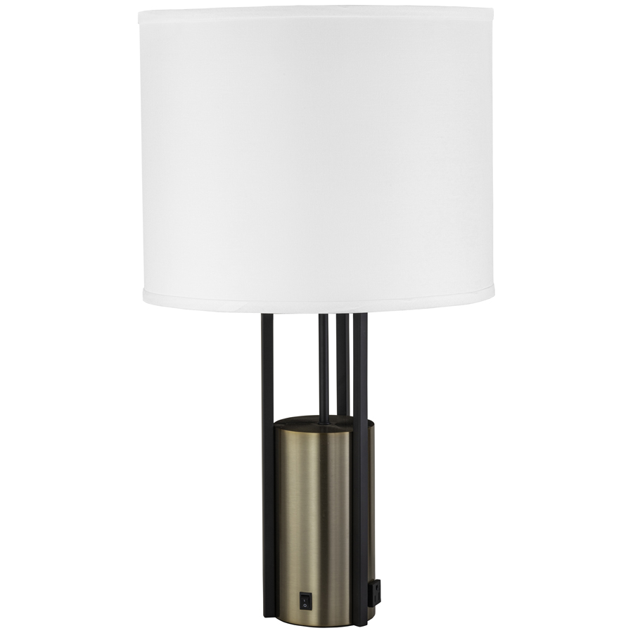 28"H Champagne Metal Column and Matte Black Table Lamp, medium base socket, on/off rocker base switch, one outlet, dual USB port A + C, 10' Silver 45° 3-prong grounded cord, all metal parts have extra clear lacquer coating, 16"x16"x13" White Linen Hardback Shade, recommend 1100 lumen LED bulb