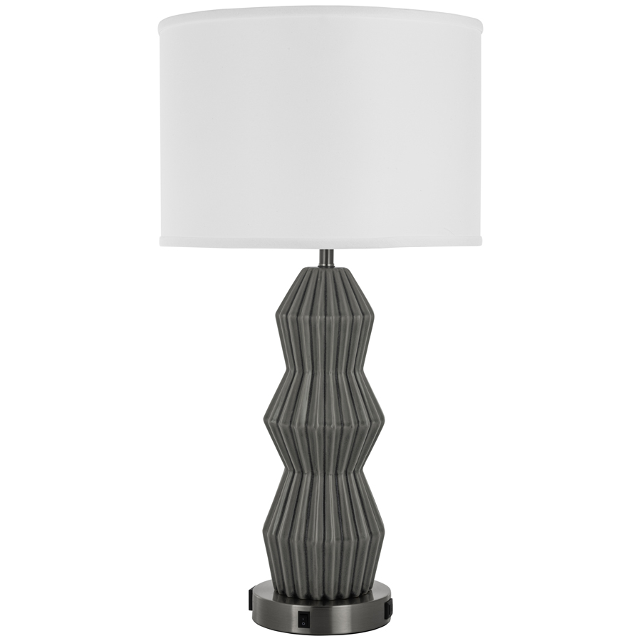 31"H Smokey Gray Glaze Ceramic and Brushed Nickel Table Lamp, medium base socket, on/off rocker base switch, one outlet, dual USB A + C port, 9' Silver 45° 3-prong grounded cord, all metal parts have extra clear lacquer coating, 16"x16"x11" White Linen Hardback Shade with top and bottom acrylic diffusers, recommend 1100 lumen LED bulb