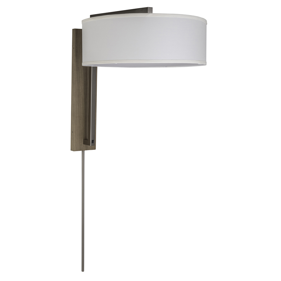 25.5"H Brushed Nickel Wall Lamp with extra clear lacquer coat and with backplate to match Wilsonart Fawn Cypress 8208K-16, dual medium base socket, on/off rocker switch on arm, 8' Silver 45° cord exiting out bottom of lamp, 24" Brushed Nickel cord cover, 20"x20"x7" Cream Linen Hardback Shade with Rolled Edges with Bottom Acrylic Diffuser, 28.5" overall depth, recommend 800 lumen LED bulbs