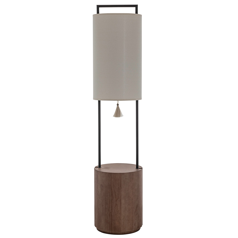 65"H Matte Black Floor Lamp with Real Wood base in finish to match Nutmeg RCD on Oak, medium base socket with Black pull chain and Light Beige Horse Hair Tassel, 8' Benjamin Moore Rocky Coats Fabric Wrapped 45° cord, 14"x14"x24" Natural Linen Hardback Shade, recommend 1600 lumen LED bulb