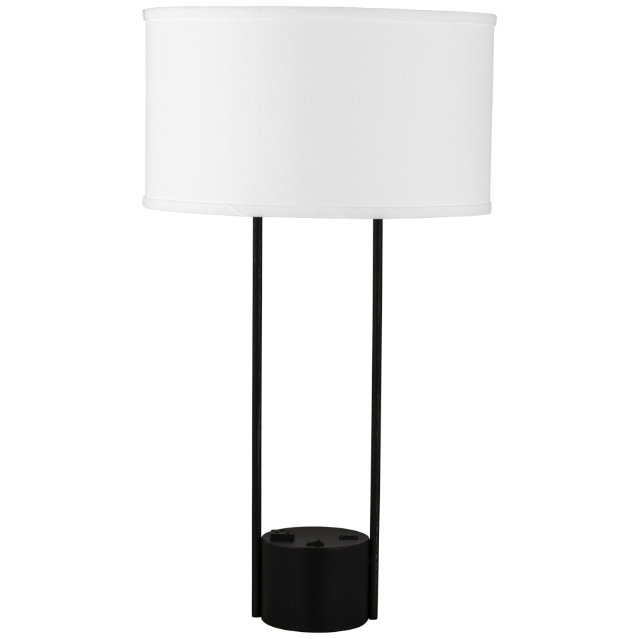 28.5"H Oil Rubbed Bronze Table Lamp, medium base socket, on/off rocker base switch, one outlet, one USB port, 10' Silver 45° 3-prong grounded cord, 12"x16"x12"x16"x9" Oval White Linen Hardback Shade, recommend 1100 lumen LED bulb