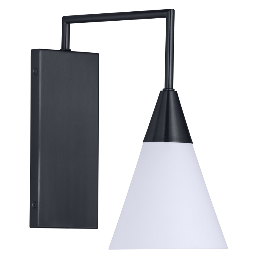 12"H Brushed Nickel Wall Lamp, medium base socket, 5' Black 45° cord exiting out bottom of lamp, White Frosted Acrylic Cone Shade, all metal parts have extra clear lacquer coating, recommend 1100 lumen LED bulb