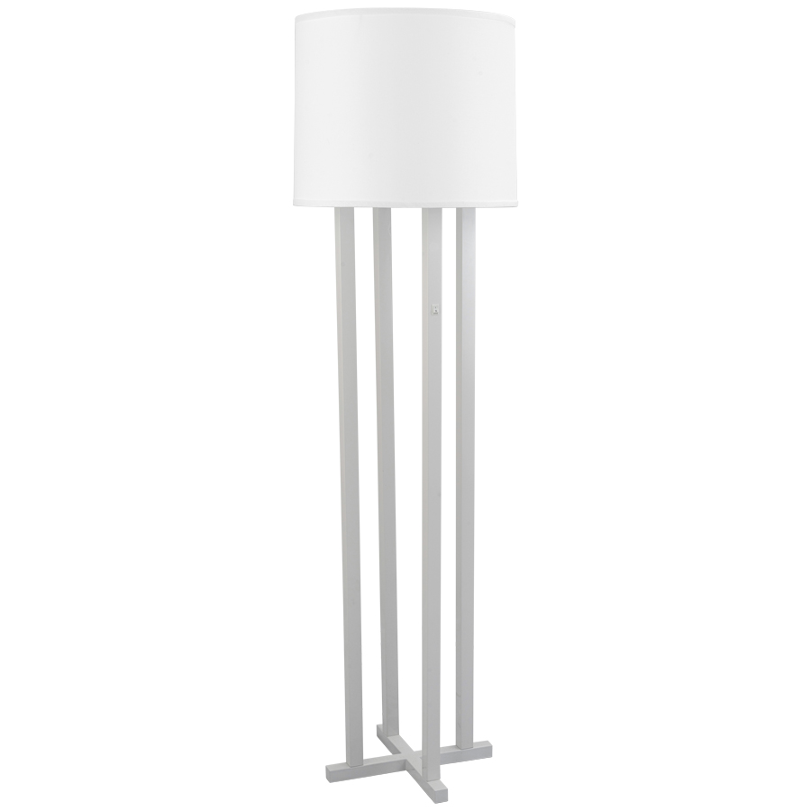 64"H Powder Coat to match SW7006 Extra White in Satin Floor Lamp, three medium base sockets, on/off white rocker switch on column @ 42"AFF, 8' Silver 45° cord, with 17"x18"x14" White Linen Hardback Shade, recommend three 1600 lumen LED bulbs
