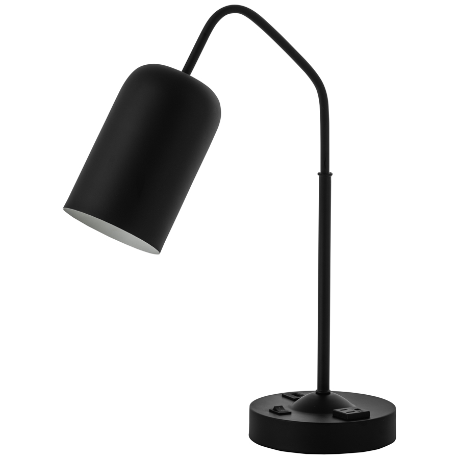 17.75"H Matte Black Table Lamp, medium base socket, on/off rocker base switch, one outlet, one USB port, 8' Silver 45° 3-prong grounded cord, Matte Black Metal Shade, recommend 8 watt LED bulb