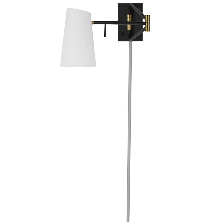 10"H Matte Black and Aged Gold Wall Lamp, medium base socket, on/off rocker switch at backplate, 7' Silver 45° cord, 4.5' Matte White cord cover, with swivel arms that extends 17" and 29", with 3.75"x5.5"x9" White Linen Hardback Shade, recommend 8 watt LED bulb