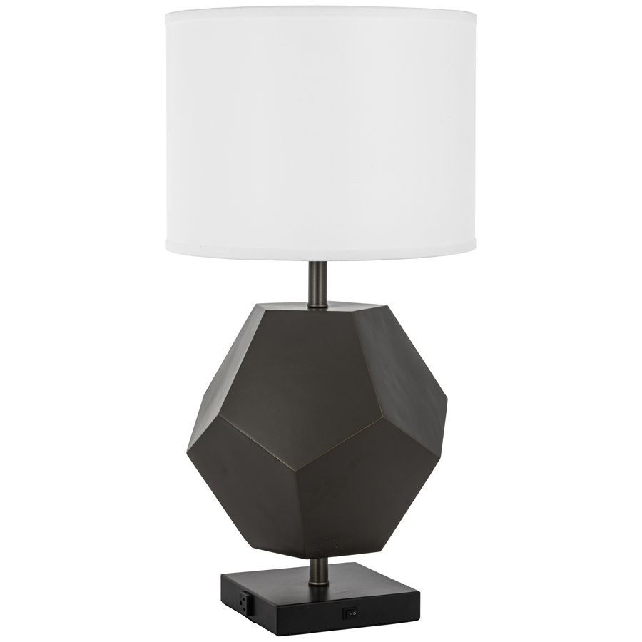 31"H Copper Bronze with Gold finish edges poly resin and Matte Black Table Lamp, two medium base sockets, on/off rocker base switch, one outlet, one USB port, 9' Silver 3-prong grounded cord with straight plug, all metal parts to be powder coated, 16"x16"x12" White Linen Hardback Shade, with 10" Powder Coat Copper Bronze Harp & Finial, recommend two 1100 lumen LED bulbs