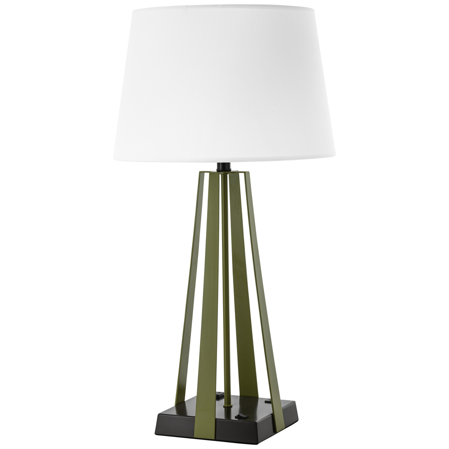 30"H Powder Coat to match Pantone 8624C and Pantone 7764C Table Lamp, two medium base sockets, on/off rocker base switch, one outlet, one USB port, 9' Silver 3-prong grounded cord with straight plug, all metal parts to be powder coated, 13"x14"x10.5" White Linen Hardback Shade, with 8.5" Powder Coat Harp & Finial to match Pantone 8624C, recommend two 1100 lumen LED bulbs