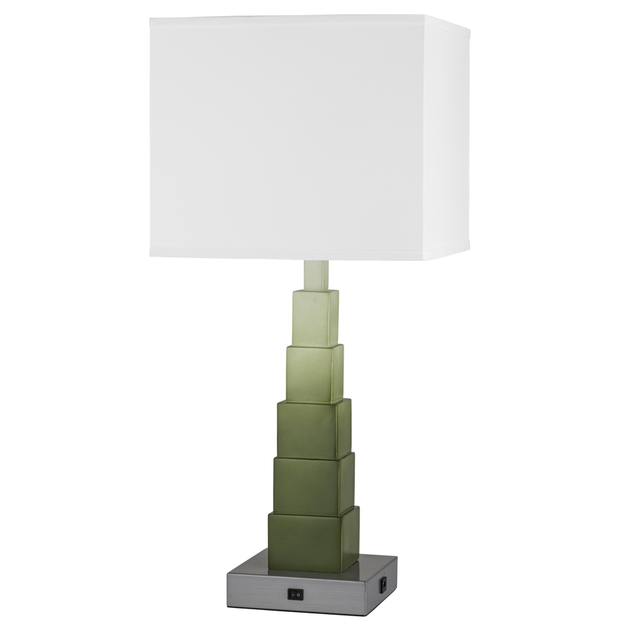 30.75"H Resin column to match Pantone 7746C and ombre lighter up and Powder Coat Brushed Nickel Table Lamp, two medium base sockets, on/off rocker base switch, one outlet, one USB port, 9' Silver 3-prong grounded cord with straight plug, all metal parts to be powder coated, 14"x14"x14"x14"x12.5" Square White Linen Hardback Shade, with 10" Powder Coated Harp & Finial, recommend two 1100 lumen LED bulbs