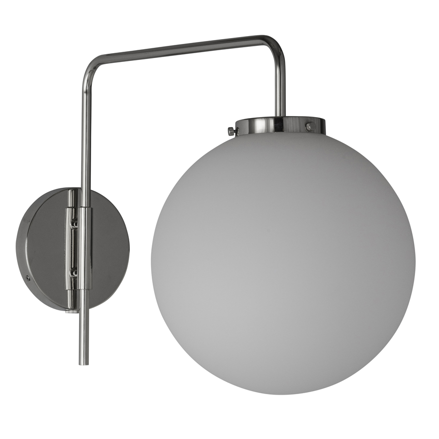 16.25"H Polished Nickel Wall Lamp, medium base socket, 6' White 45° cord, with 24" cord cover in finish to match SW9149 Inky Blue, 12" diameter Milk Glass Globe, recommend 800 lumen LED bulb