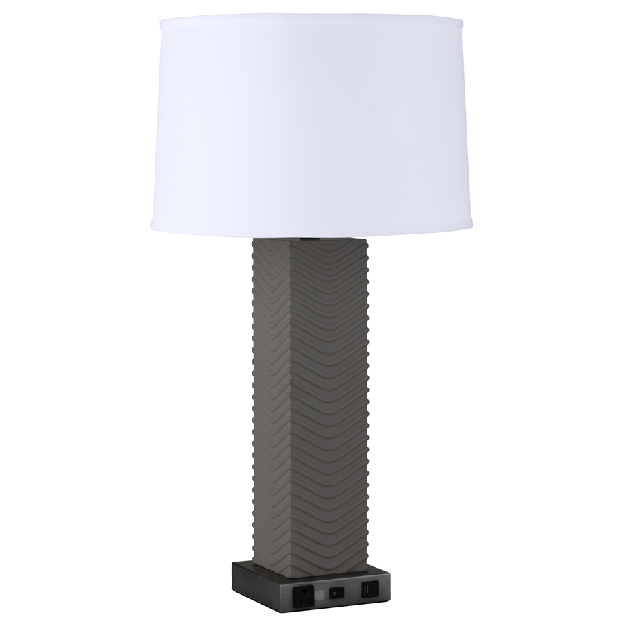 31"H Taupe Resin and Brushed Silver Table Lamp, medium base socket, on/off rocker base switch, one outlet, one USB and one USB-C port, 8' Silver 45° 3-prong grounded cord, 16"x17"x11" White Linen Hardback Shade, recommend 1100 lumen LED bulb