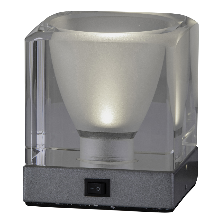 4"H Clear Cast Crystal Rechargeable LED Table Lamp with Powder Coat Metallic Silver base, 3 watt LED, 120V~5V, one mini rocker switch, with wireless charging connection on bottom, battery powered
