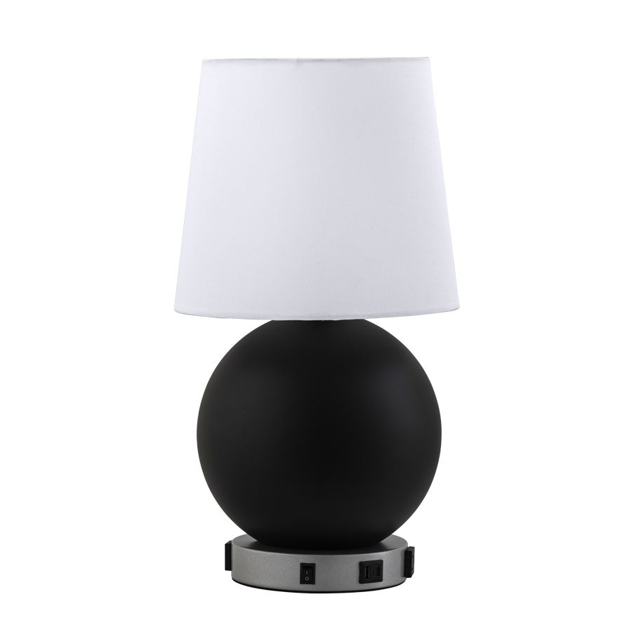 21"H Powder Coated RAL 9011 Graphite Black Table Lamp with base to match Sparkle Silver Glossy 49/90450, medium base socket, on/off rocker switch, two outlets, dual USB A +C port, 6' Silver 45° 3-prong grounded cord, 9.5"x11.75"x10" White Linen Hardback Shade with Rolled Edges, recommend 800 lumen LED bulb