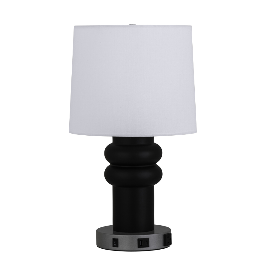 23"H RAL 9011 Graphite Black Resin Table Lamp with Powder Coat Sparkle Silver Glossy 49-90450 base, medium base socket, on/off rocker base switch, two outlets, dual USB A +C port, 6' Silver 45° 3-prong grounded cord, 11"x12"x10" White Linen Hardback Shade with Rolled Edges, recommend 800 lumen LED bulb
