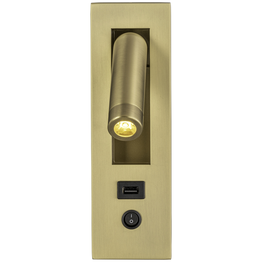 8.5"H Satin Gold Integrated LED Reading Light, 3 watt LED, 3000K, 120V, on/off mini round rocker switch, one USB port, 8' Silver 45° cord exiting out back of lamp