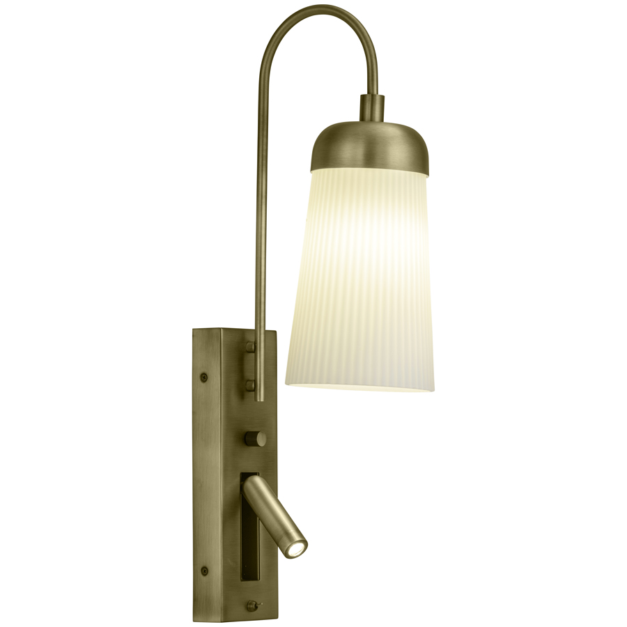 25"H Antique Brass Wall Lamp with LED Reading Light, one medium base socket and one 3 watt LED, one rotary dimmer switch and one toggle switch, 8' Black 45° cord exiting out back of lamp, with Fluted Frosted Glass Shade, recommend 800 lumen LED bulb