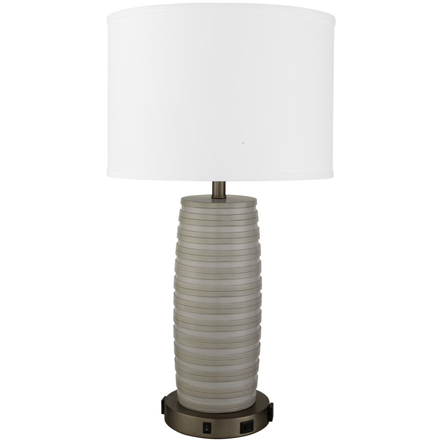 30"H Resin Faux Terracotta Rustic Gray to match SW7017 Dorian Gray and SW7016 Mindful Gray Table Lamp with Chemetal 935 Dark Bronze Aluminum base, medium base socket, on/off rocker base switch, two outlets, dual USB port A + C, 8' Silver 45° 3-prong grounded cord, 16"x16"x11" White Linen Hardback Shade, with 9" harp & finial, recommend 1100 lumen LED bulb