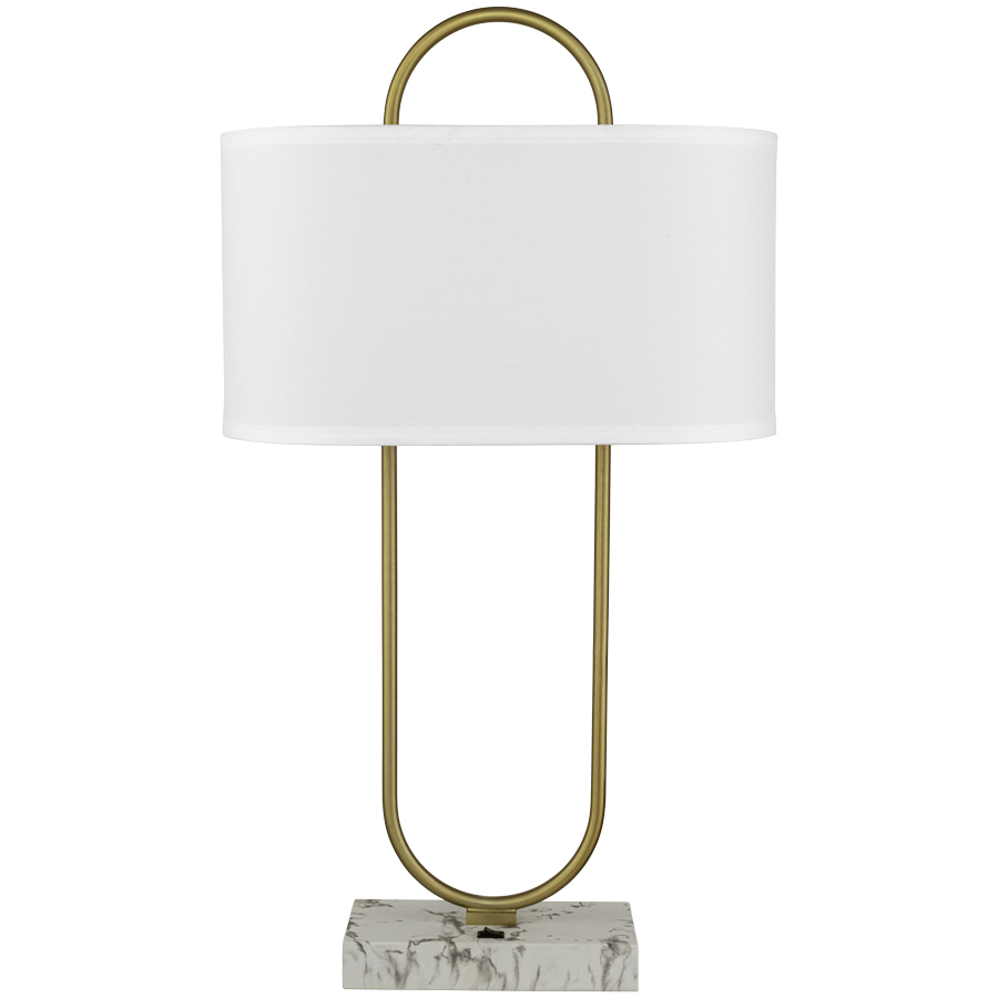 30"H Chemetal 704 Brushed Light Brass Aluminum Table Lamp with Water Transfer White Marble base, medium base socket, on/off rocker base switch, 8' Silver 45° cord, 9"x17"x9"x17"x9" Oval White Linen Hardback Shade, recommend 1100 lumen LED bulb