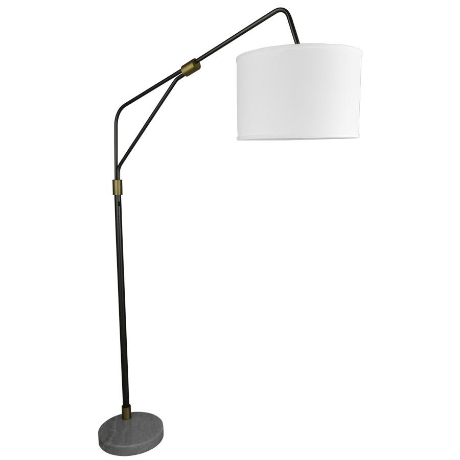 71"H Chemetal 917 Brushed Black Aluminum and Chemetal 704 Brushed Light Brass Aluminum Floor Lamp with White Faux Marble base, medium base socket, on/off rocker switch on column @ 44"AFF, 8' Silver 45° cord, 15"x15"x10" White Linen Hardback Shade, recommend 1100 lumen LED bulb. Ships Knock Down.