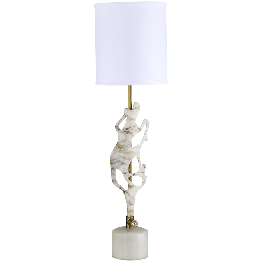 31.-5/8"H Water Transfer Marble Metal Table Lamp with White Marble Base and Plated Warm Brass on stem and accent, medium base socket, on/off press switch, 8' Silver 45° cord, 9.5"x9.5"x10" White Linen Hardback Shade, recommend 1100 lumen LED bulb