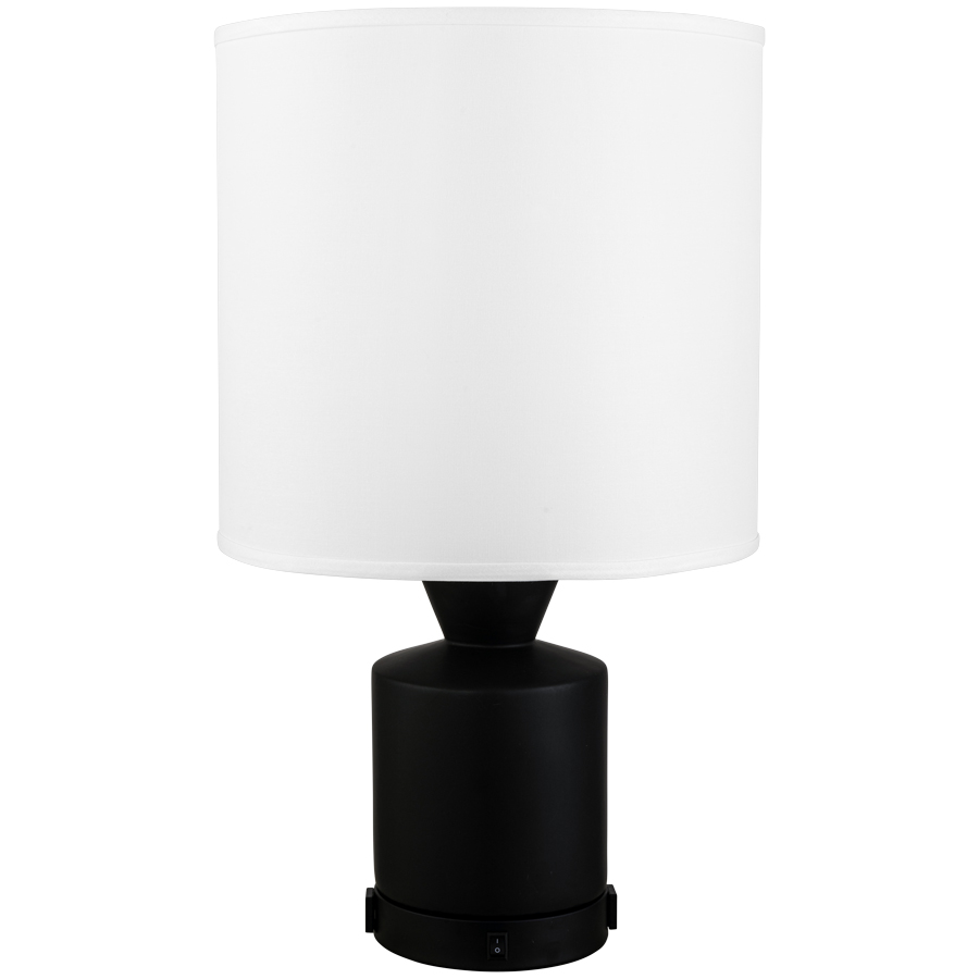 28"H Matte Black Ceramic Table Lamp with Matte Black base, medium base socket, on/off rocker base switch, two outlets, 8' Silver 45° 3-prong grounded cord, 16"x16"x15" White Linen Hardback Shade, recommend 1600 lumen LED bulb