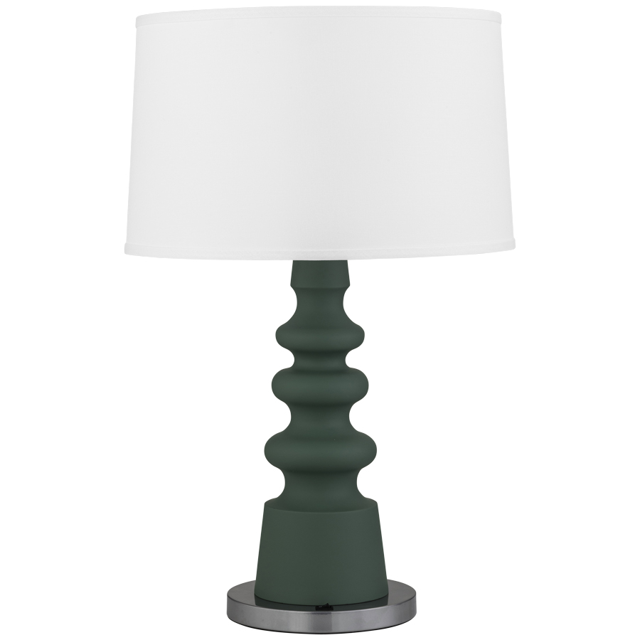 28.5"H SW6467 Kendall Green Resin and Powder Coat Chrome Table Lamp, medium base socket, on/off rocker base switch, 8' Silver 45° cord, with 17"x18"x11" White Linen Hardback Shade, with 9" harp & finial, recommend 1100 lumen LED bulb