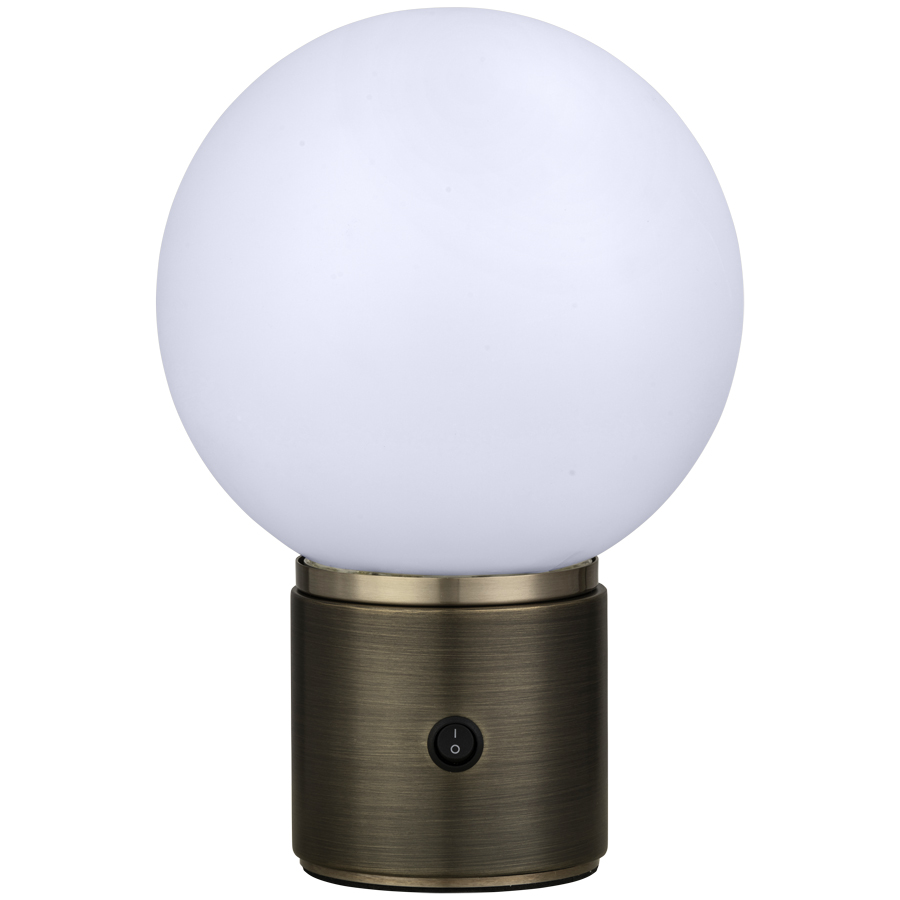 10.25"H Plated Dark Bronze and Plated Champagne Bronze Table Lamp, medium base socket, on/off mini round rocker base switch, 8' Silver 45° cord, White Frosted Acrylic Globe, recommend 800 lumen LED bulb