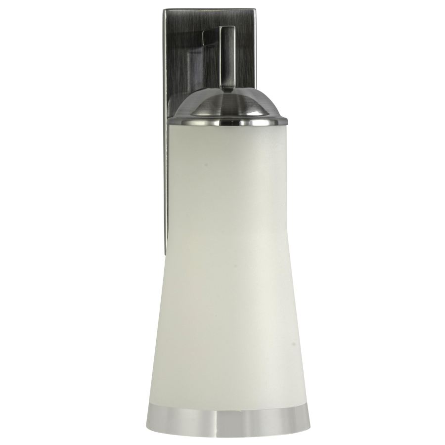 13"H Brushed Stainless Steel Wall Lamp, medium base socket, 8' Silver 45° cord exiting out back of lamp, with Frosted Acrylic Shade with 3/4" Clear Bottom Trim, recommend 1100 lumen LED bulb