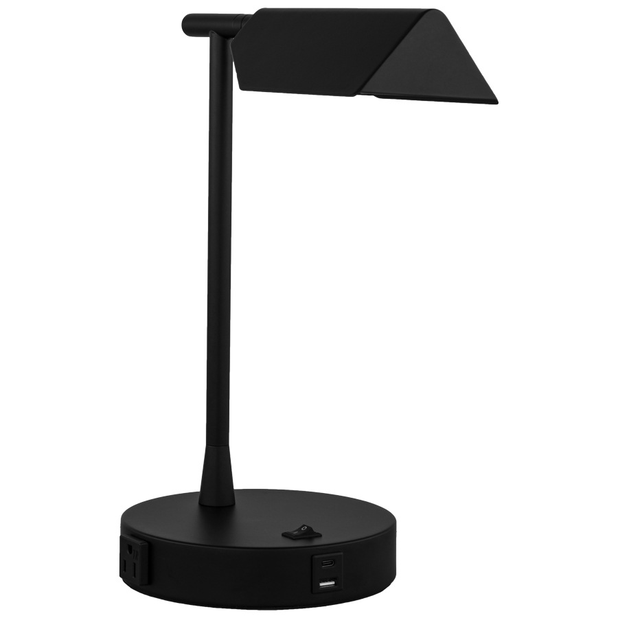 14.5"H Matte Black Table Lamp, E12 socket, on/off rocker base switch, one outlet, dual USB port A + C, 8' Black 45° 3-prong grounded cord, with Matte Black Metal Shade with White Frosted Acrylic Bottom Diffuser, recommend 5 watt LED Candelabra bulb
