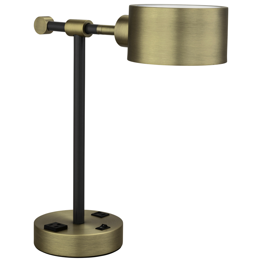 16"H Brushed Brass and Smoked Gunmetal Table Lamp, medium base socket, on/off rocker base switch, one outlet, dual USB A + C port, 8' Silver 45° 3-prong grounded cord, with Brushed Brass Metal Shade, recommend 1600 lumen LED bulb