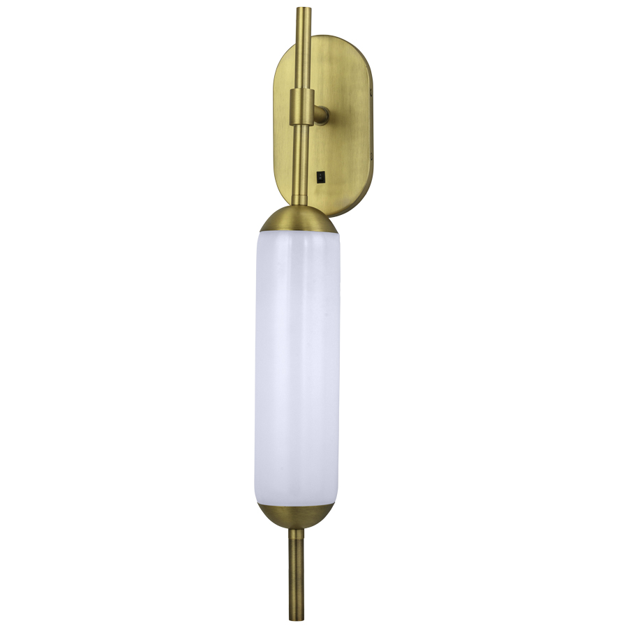 29.5"H Aged Brass Wall Lamp, medium base socket, on/off rocker switch at backplate, 8' Silver 45° cord exiting out back of lamp, with White Plastic Shade, recommend 1600 lumen LED bulb