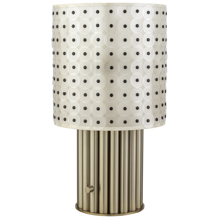 20"H Plated San Bronze Fluted Table Lamp, two medium base sockets, one dimmer base switch, 10' Silver 45° cord, includes 11"x11"x11.5" Water color tonal Translucent Die cut discs with Black Rivets Shade with top and bottom acrylic diffusers, recommend two 800 lumen LED bulbs