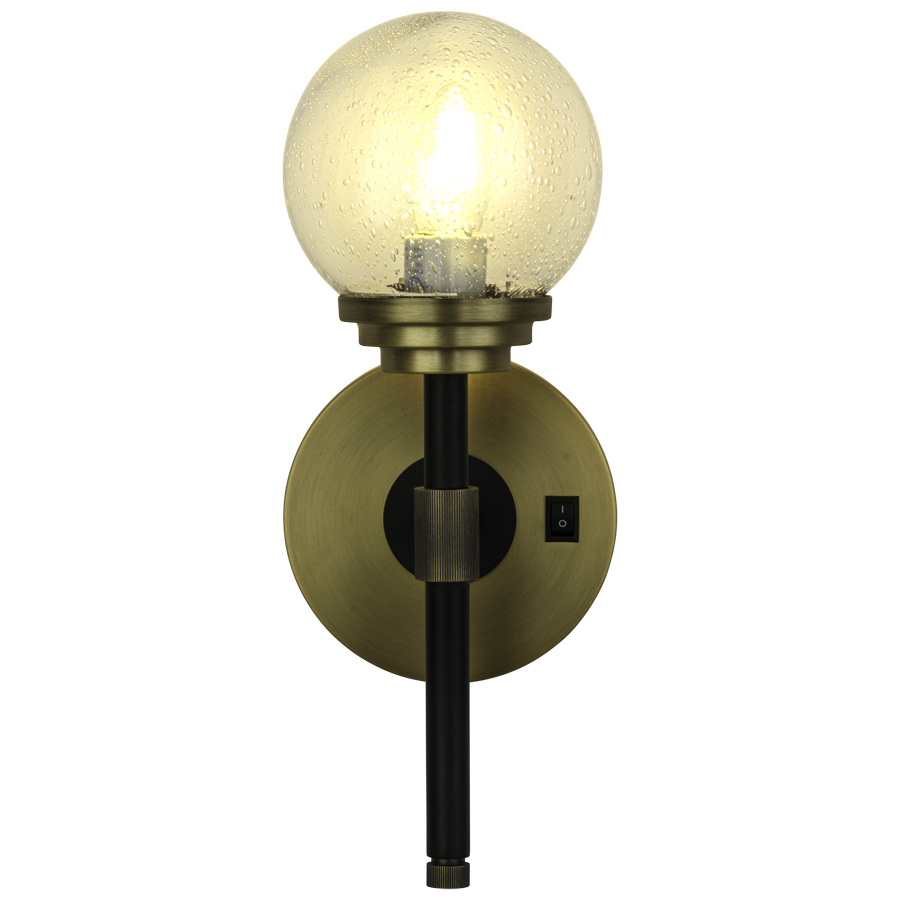 15"H Brushed Brass and Matte Black Headboard Lamp, medium base socket, on/off rocker switch at backplate, 8' Silver 45° cord exiting out back of lamp, with Clear Seeded Glass Globe, recommend 5.5 watt Clear LED bulb