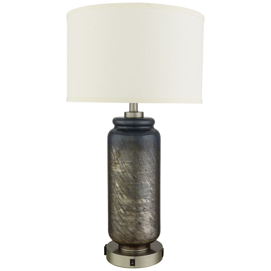 30"H Swirl Texture Glass in shades of ocean blues, greens, and metallic bronze Table Lamp with Brushed Nickel base and hardware, medium base socket, on/off rocker base switch, one outlet, Dual USB port A + C, 8' Silver 45° 3-prong grounded cord, includes 16"x16"x10" Natural Linen Hardback Shade, recommend 1100 lumen LED bulb