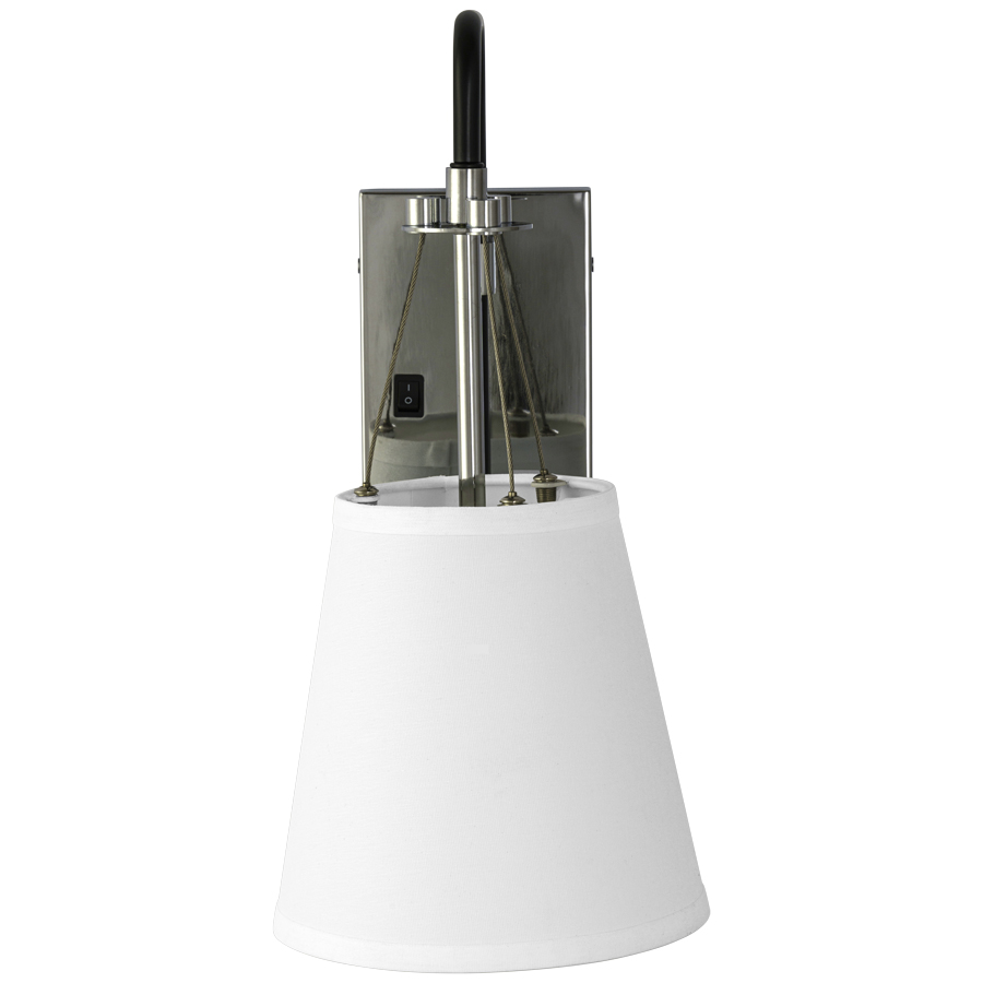 16.75"H Polished Chrome and Matte Black Wall Lamp, medium base socket, on/off rocker switch at backplate, 10' Silver 45° cord exiting out back of lamp, includes 5"x8"x8" White Linen Hardback Shade, recommend 1100 lumen LED bulb