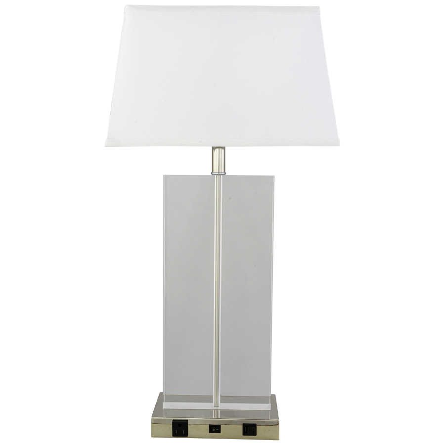 30.25"H Polished Nickel and Clear Acrylic Table Lamp, medium base socket, on/off rocker base switch, one outlet, dual USB A + C port, 10' Silver 45° 3-prong grounded cord, all metal parts have extra clear lacquer coating, includes 4"x13"x5"x16"x9.5" Rectangle White Linen Hardback Shade, recommend 1600 lumen LED bulb