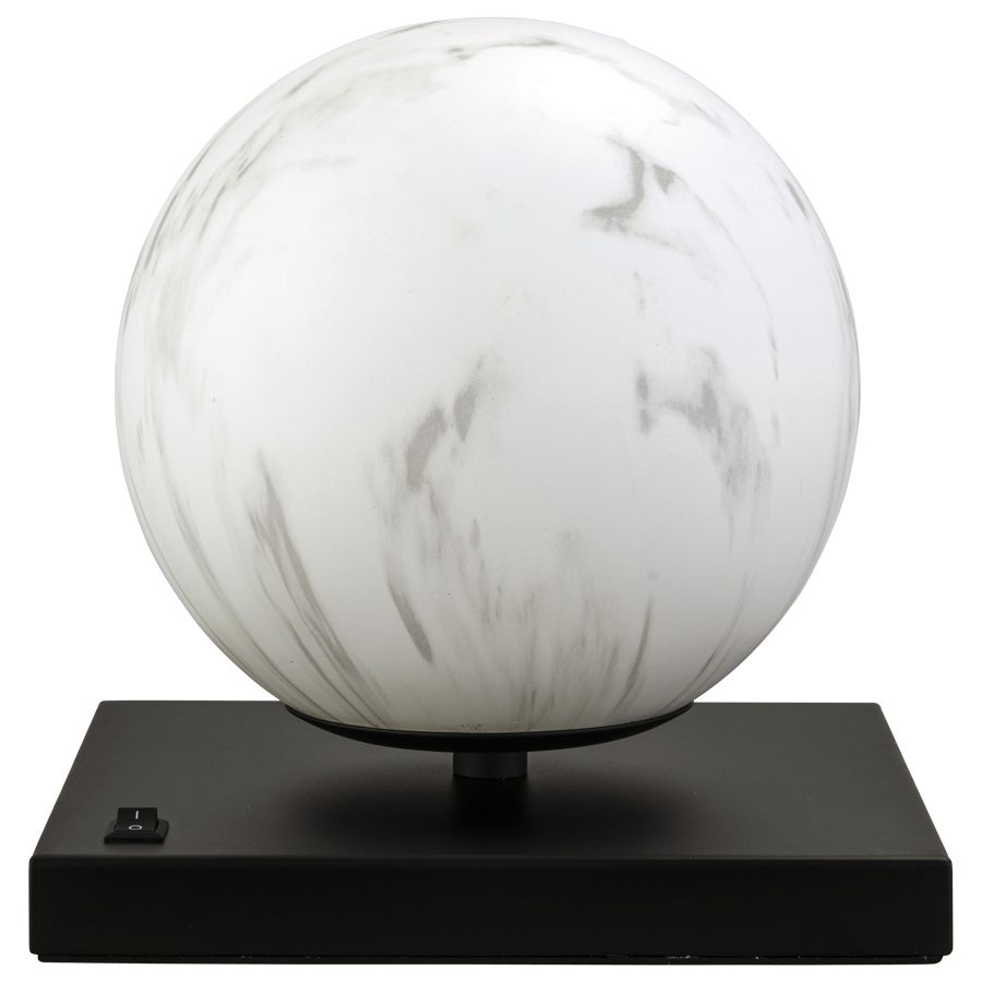 8"H Matte Black Table Lamp with 7" Alabaster Acrylic Globe, medium base socket, on/off rocker base switch, 12' Silver 45° cord, recommend 1100 lumen LED bulb