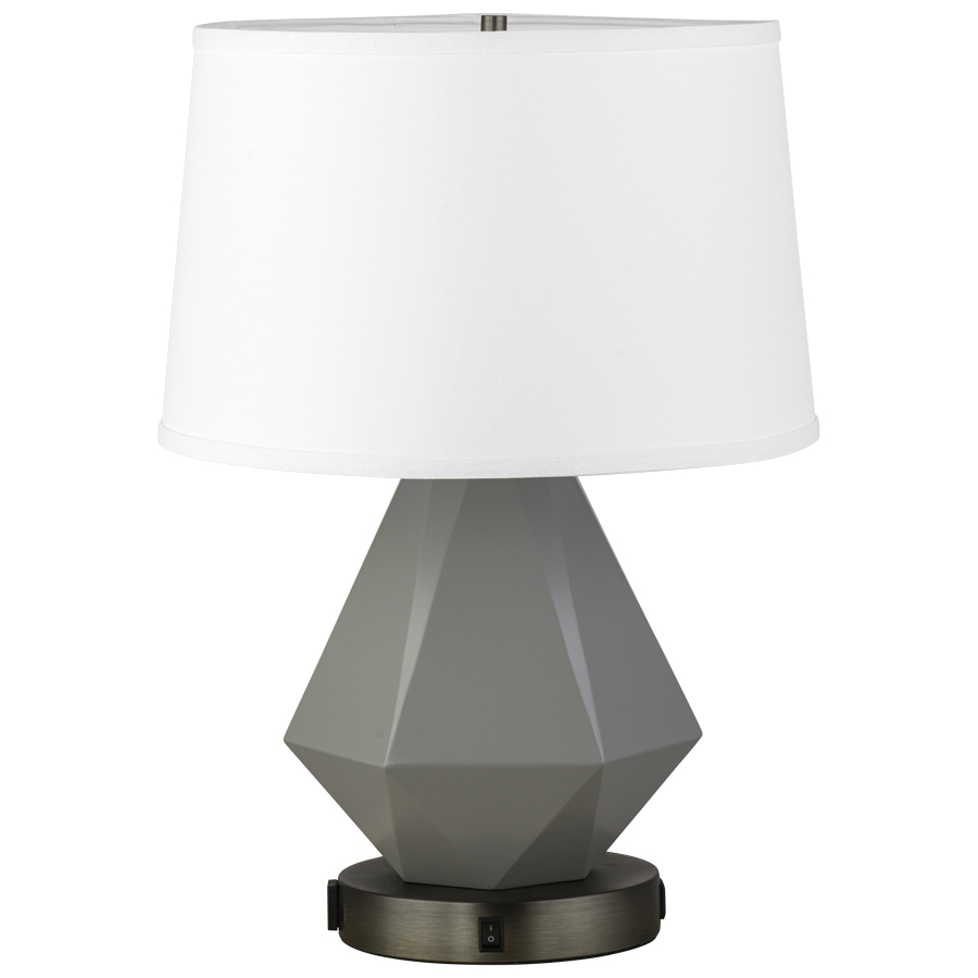 22.5"H Plated Brushed Nickel and SW9163 Tinlizzle Cast Aluminum Table Lamp, medium base socket, on/off rocker base switch, one outlet, dual USB A + C port, 10' Silver 45° 3-prong grounded cord, all metal parts have extra clear lacquer coating, includes 14"x16"x10" White Linen Hardback Shade, recommend 1600 lumen LED bulb
