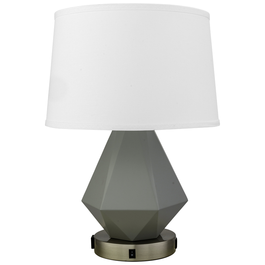 22.5"H Plated Brushed Nickel and SW9163 Tinlizzle Cast Aluminum Table Lamp, medium base socket, on/off rocker base switch, one outlet, dual USB A + C port, 10' Silver 45° 3-prong grounded cord, all metal parts have extra clear lacquer coating, includes 14"x16"x10" White Linen Hardback Shade, recommend 1600 lumen LED bulb