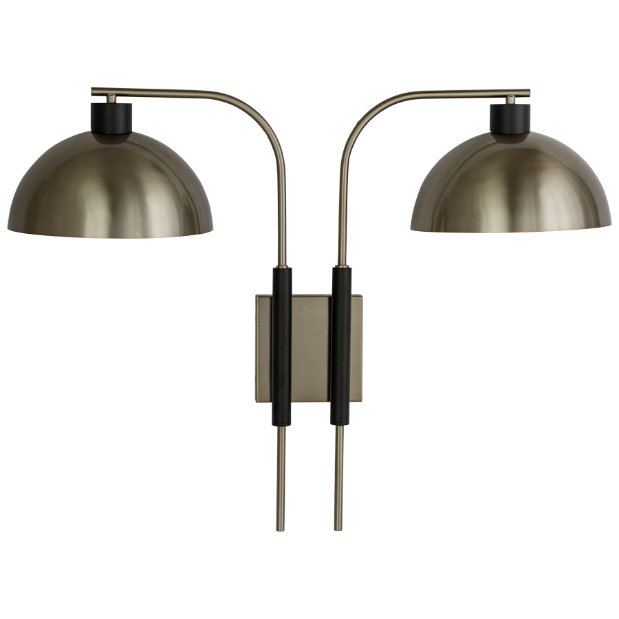 22.25"H Plated Champagne Bronze and Matte Black Wall Lamp, two medium base sockets, direct wired, with two Champagne Bronze Metal Half Dome Shades with Painted Brass interior, recommend two 1100 lumen LED bulbs
