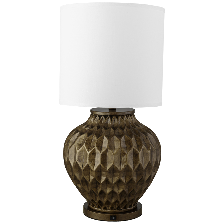 29"H Painted Aged Brass Resin Table Lamp with added Powder Coated Aged Brass metal base, dual medium base socket, on/off rocker base switch, 9' Silver cord with straight plug from socket, 16"x16"x13" Natural Linen Hardback Shade, recommend two 1100 lumen LED bulbs