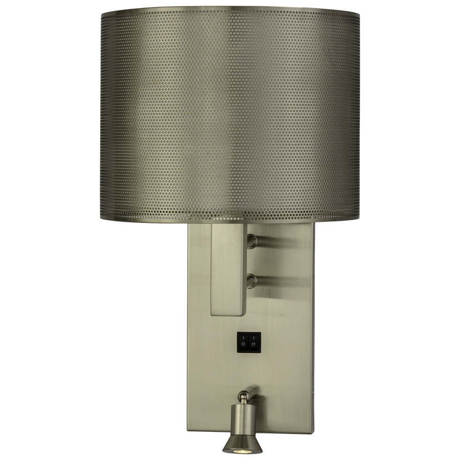 16"H Brushed Nickel Wall Lamp with reading light, one GU24 socket and one 3 watt LED, dual on/off rocker switch at backplate, 8' Silver 45° cord exiting out back of lamp, with 9.25"x9.25"x7.25" Brushed Nickel Metal Mesh Outer Shade and White Linen Hardback Inner Shade, recommend 1100 lumen LED bulb with GU24 base