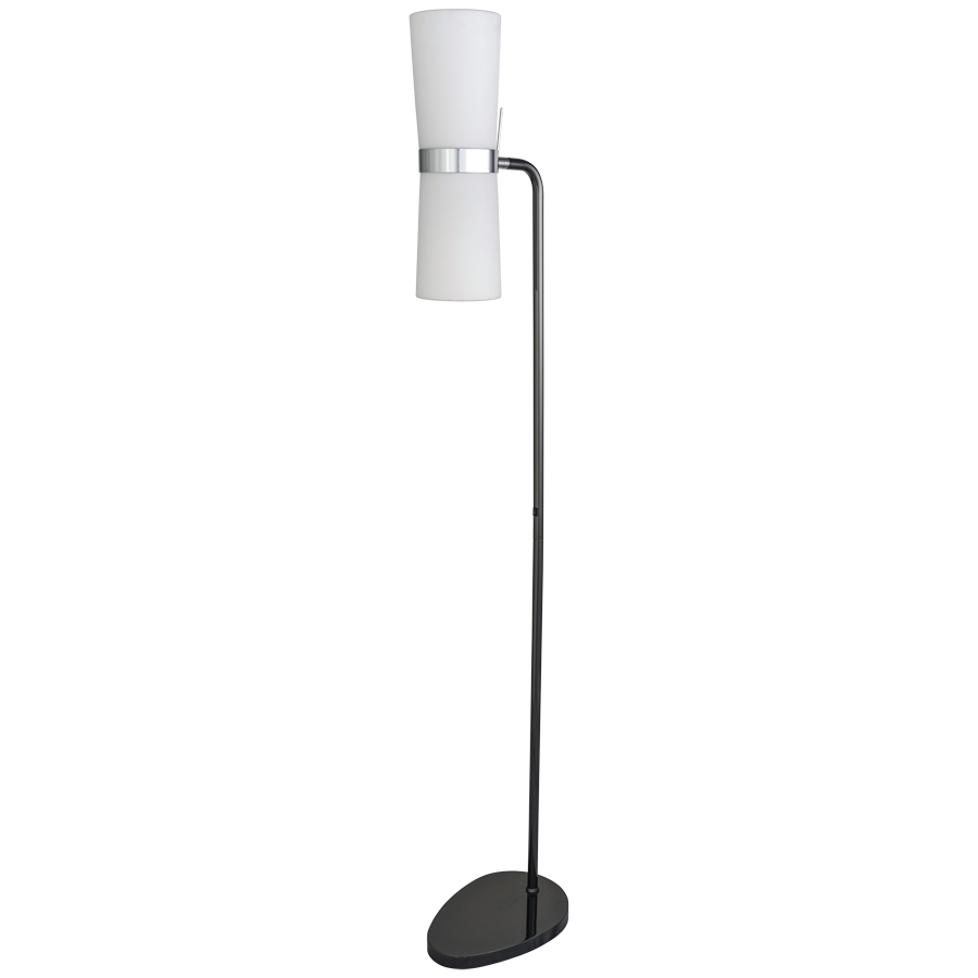 60"H Black Polished Chrome and Polished Chrome Floor Lamp, two medium base sockets, one mini rocker switch on column, 6' Silver cord with straight plug, two White Frosted Glass Shades, recommend two 800 lumen LED bulbs